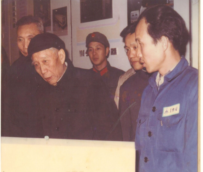 1982年國家副主席王震參觀廣州電子所研制的全國第一臺封離型氮分子激光器。